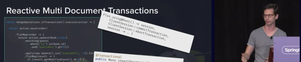 ▶ Next Generation MongoDB: A Look at Sessions, Streams, and Transactions — A joint session of MongoDB and Pivotal engineers showing off newer MongoDB features like sessions, change streams, retryable writes, reactive access and, yes, MongoDB 4.0’s transactions. A talk that’s particularly well suited for Java developers. Christoph Strobl and Jeff Yemin |